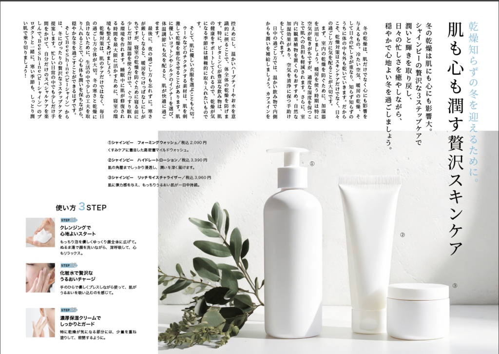 リーフレットを作ろう[レイアウト] Illustrator 2025.12.20 目次 チュートリアル成果物ポイント表紙中面裏表紙感想 チュートリアル Adobe公式 成果物 ポイント 表紙 右上の要素はDIC特色を使用 左下の要素は視認性をあげるため、黒ぼかしの座布団あり シャイニーというカタカナ読みをつける発想は全く思いつかないが、見事に収まっている 中面 文字サイズ、フォント 余白によるグルーピング 情報、視線の流れ 裏表紙 Screenshot 感想 適当ではなく、計算を使って余白や要素の大きさを算出しているのが印象的だった。