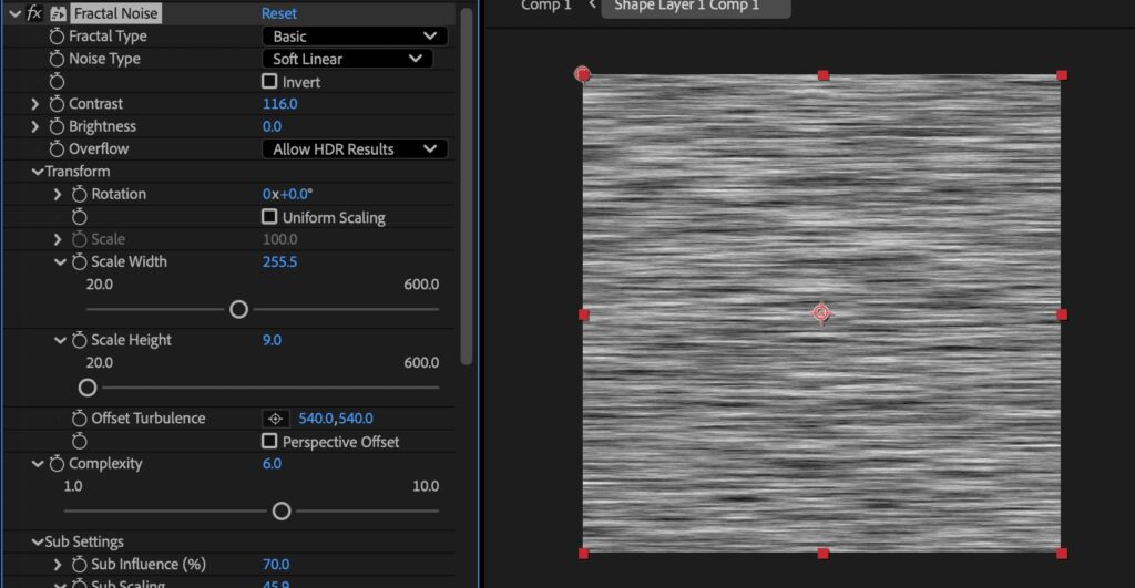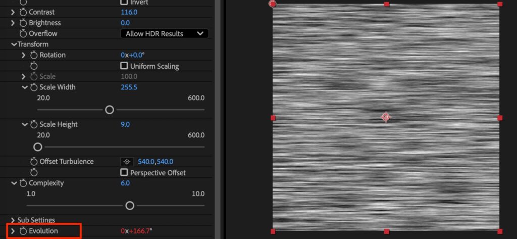 • fractalのrandom seedにエクスプレッション time * 100をいれることでランダムなノイズになる