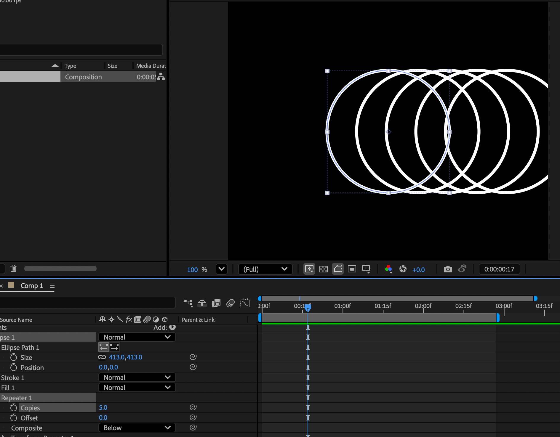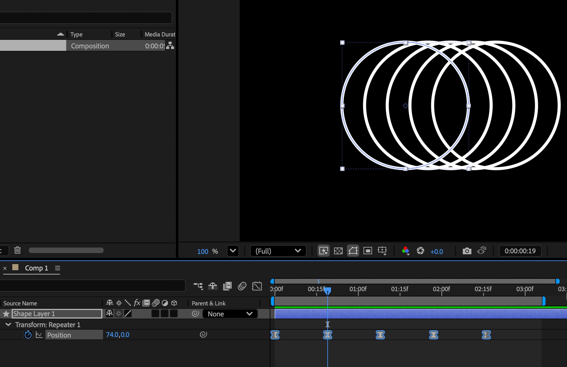 50モーション完全解説 7/50 AfterEffects 2025.09.092025.09.19 目次 チュートリアル作業のながれ成果物 作成を終えた感想 チュートリアル https://youtu.be/LpE-5QH-rgQ?si=bWohe4znRIeahz2y 作業のながれ 円を作成し > add > repeater > 5回 Screenshot transform repeaterで位置の設定 成果物 作成を終えた感想 キーフレームをすべて選択して最後のキーフレームをopt+ドラッグで尺変更