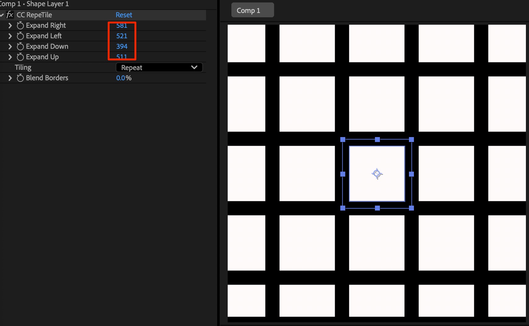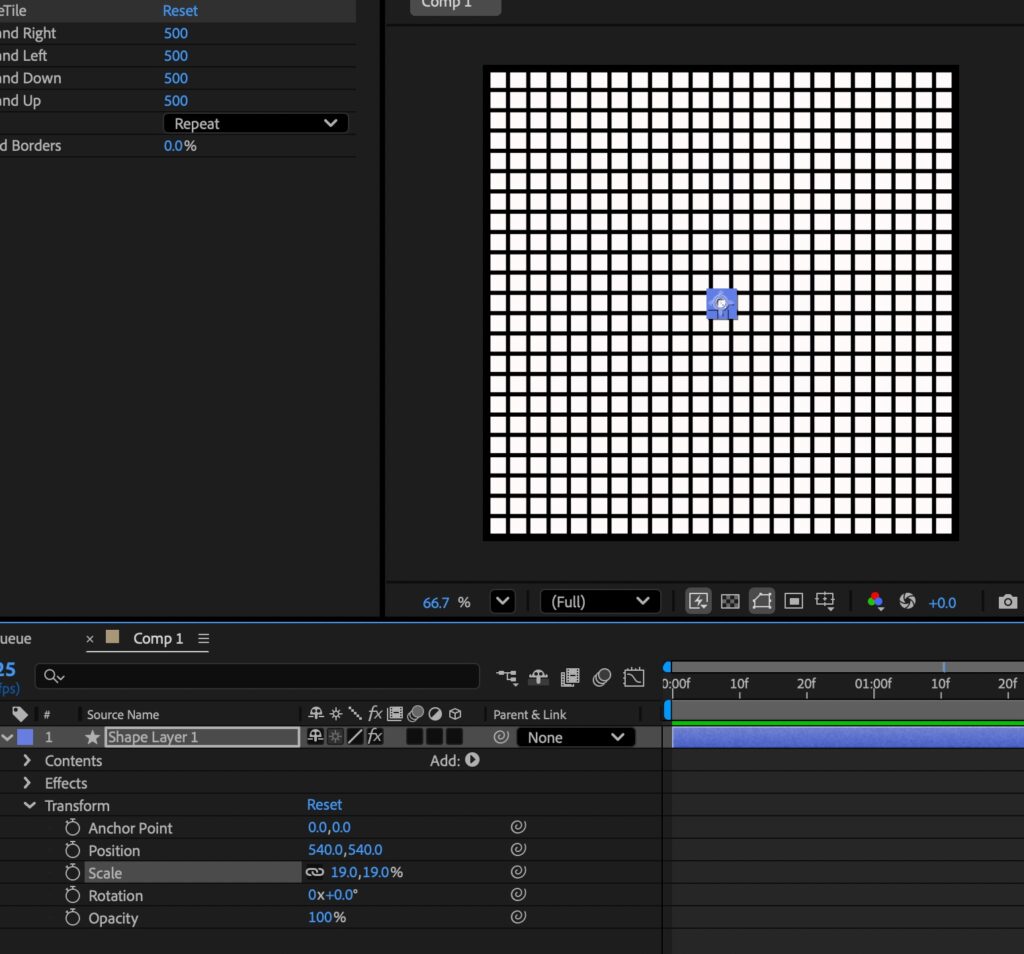 50モーション完全解説(tile) 17/50 AfterEffects 2025.09.192025.10.03 目次 チュートリアル作業のながれ成果物 作成を終えた感想 チュートリアル https://youtu.be/LpE-5QH-rgQ?si=bWohe4znRIeahz2y 作業のながれ contentsの中に四角形を2つ作成 外の四角形のopacityを0 Screenshot CC RepeTileを適用しExpandする 領域を設定してその大きさの範囲をタイリングして埋め尽くす レイヤーのscaleを調節することで1つ1つのブロックの大きを変えることができる 成果物 作成を終えた感想 背景作成時とかに使えそう