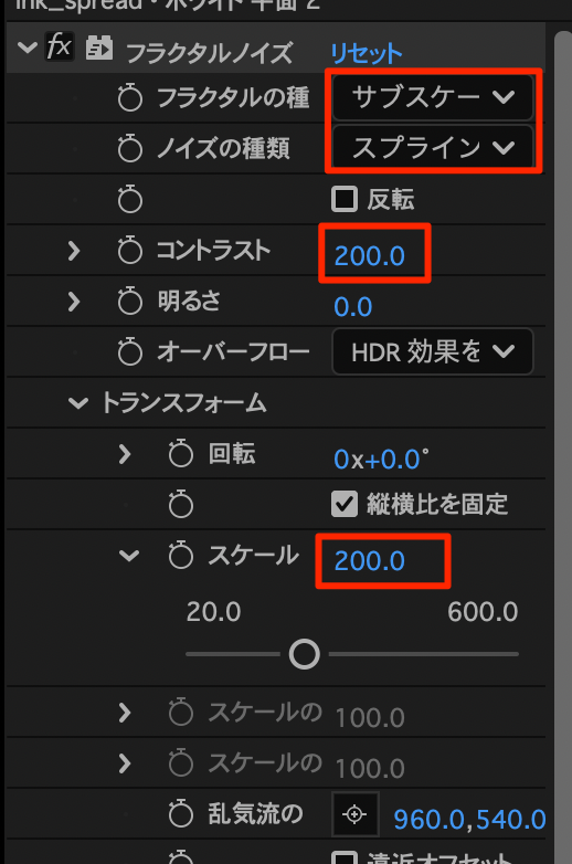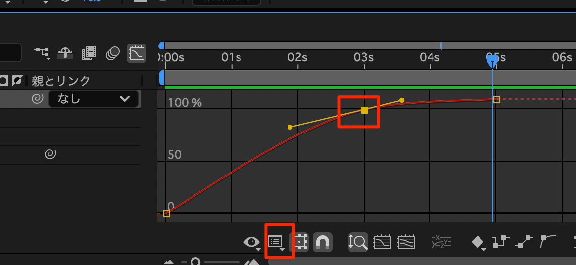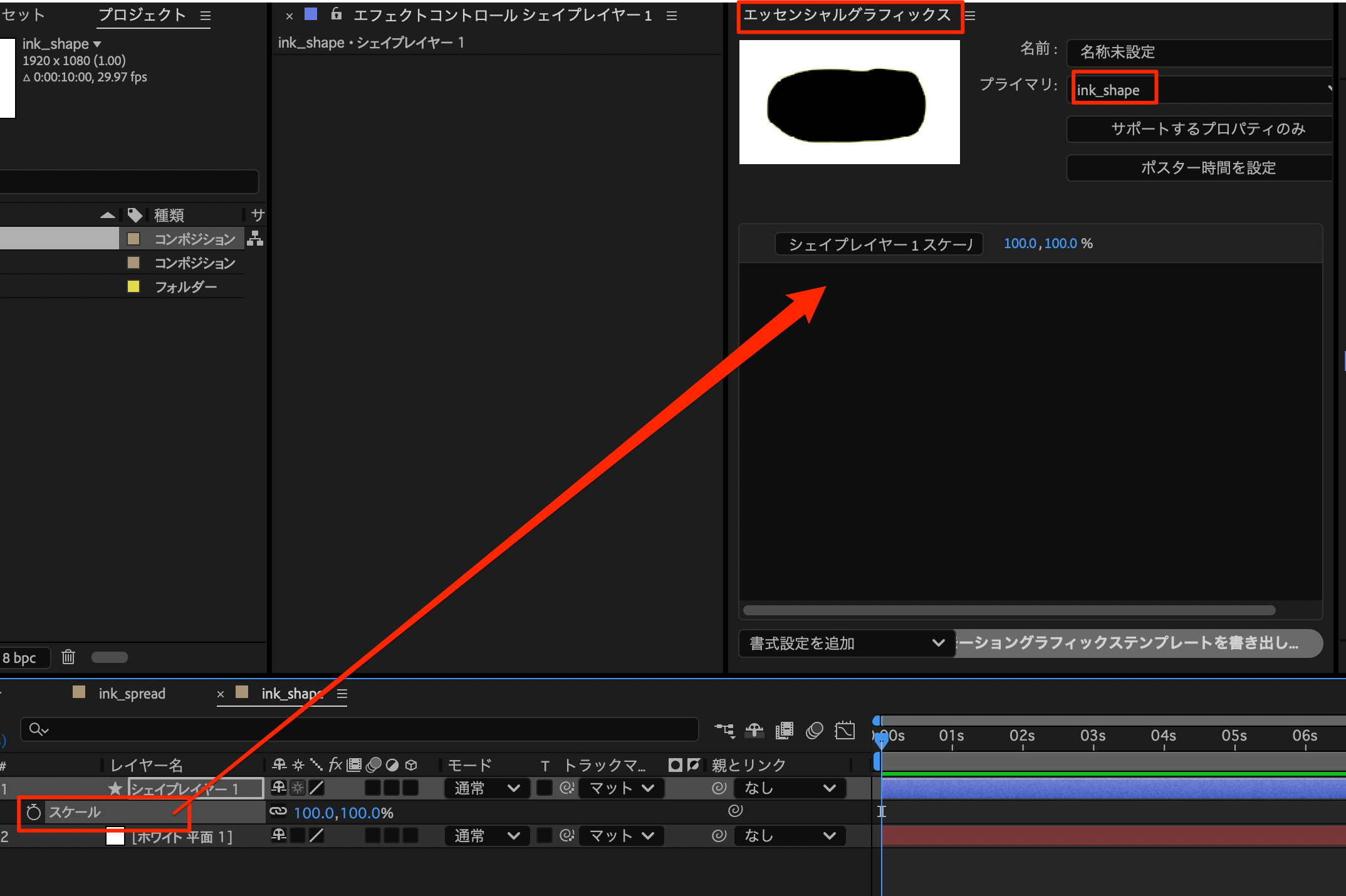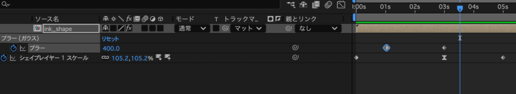 - エッセンシャルプロパティとしてスケールが現れるので0秒(0)3秒(100)5秒(110)にキーフレーム