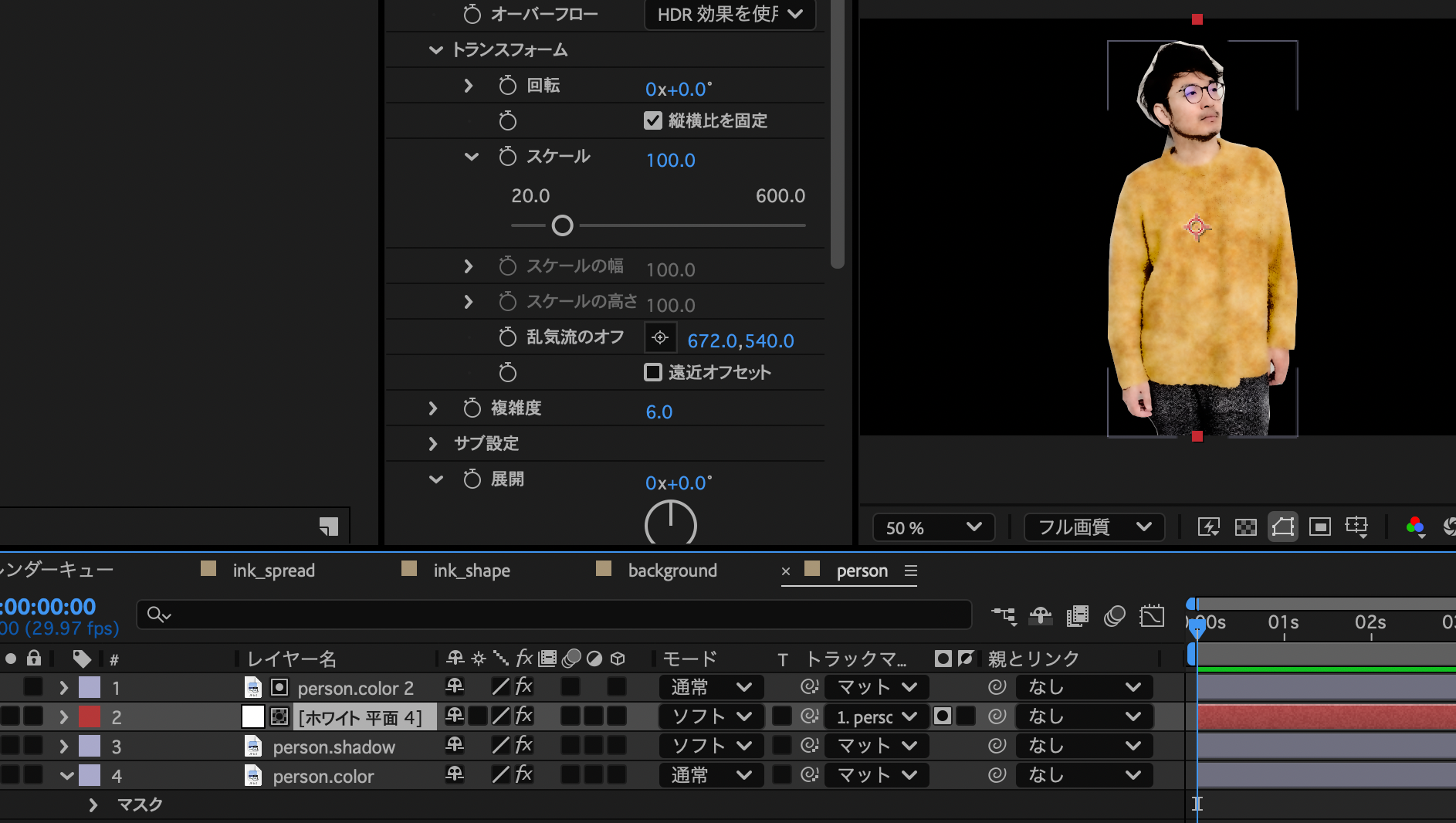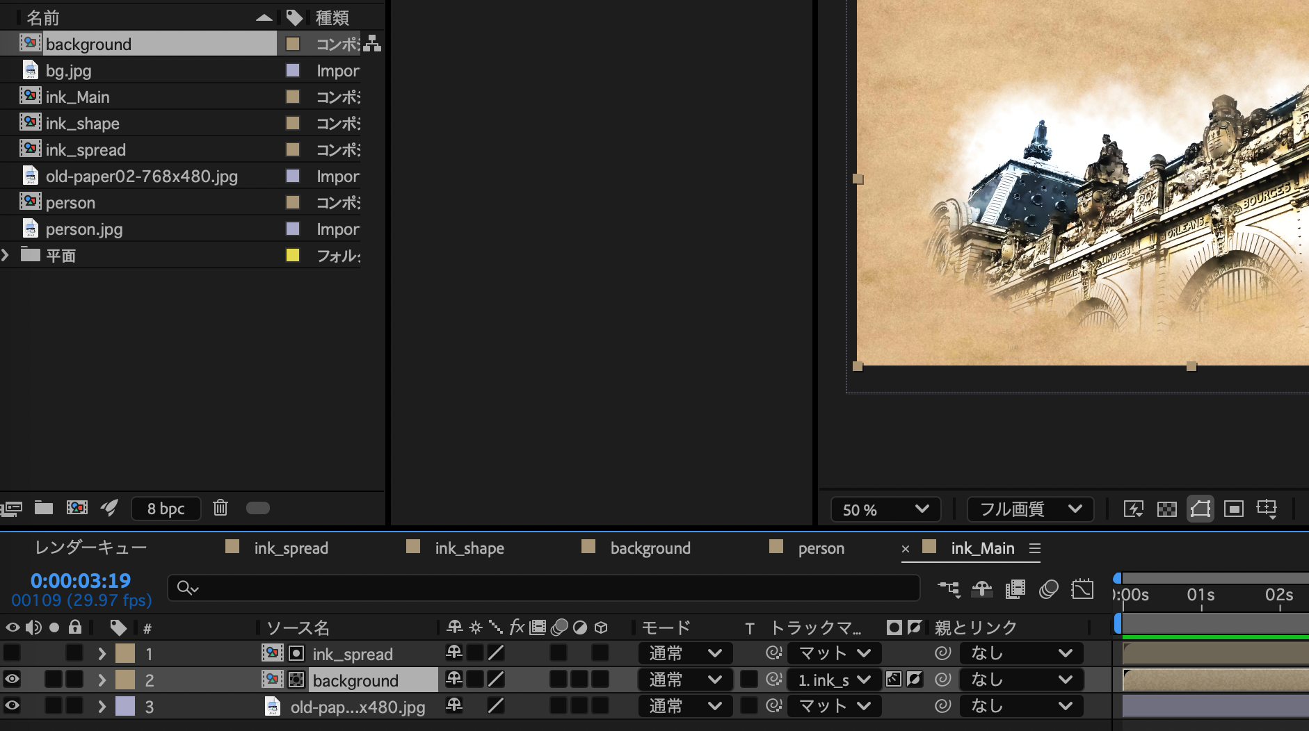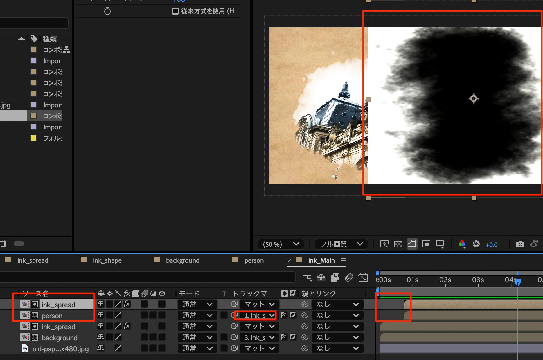 - backgroundトラックマットにink_spread このときルミナンスと反転にチェック