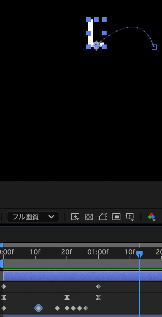 - 位置にキーフレームを打って移動。この際ペンツールを持つことでハンドルを調節できる。