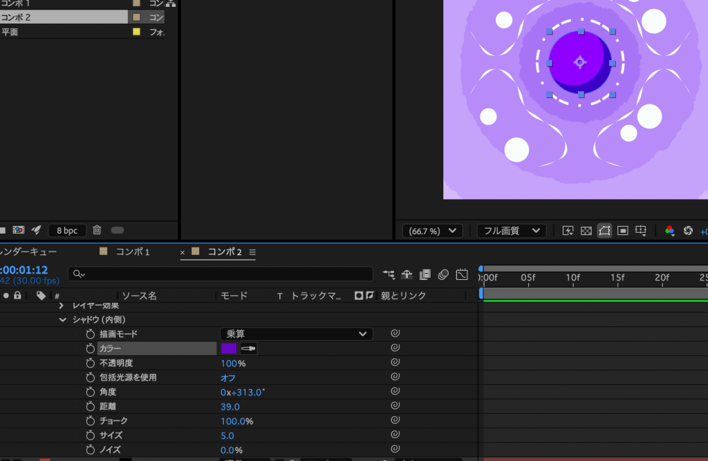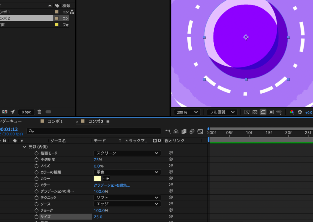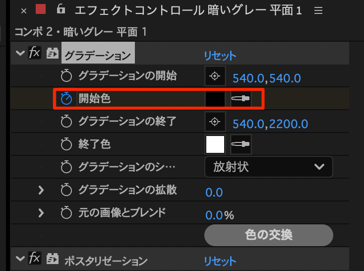 - 0フレームで開始色を白,数フレーム進めて黒にすることでポスタリゼーションによってできた円がアニメーションする