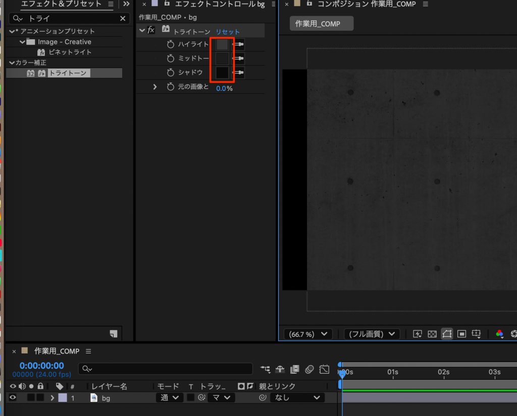 • トライトーンエフェクト(ハイライト、ミッドトーン、シャドウの色を任意に変更する)かけ、それぞれくらいグレイにする。