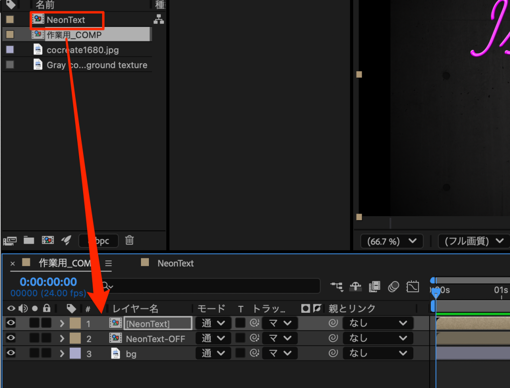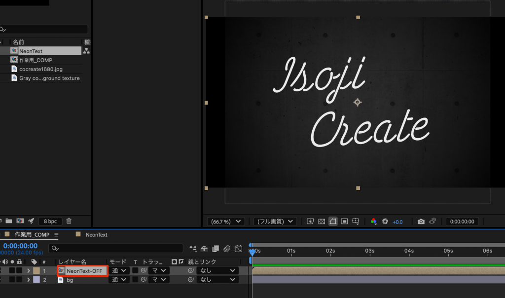 • 作業用COMPを開きNeonTextコンポジションを配置する。名前をNeonText-OFFにする(下画像は文字がモノクロになっているが本来は色がついている)