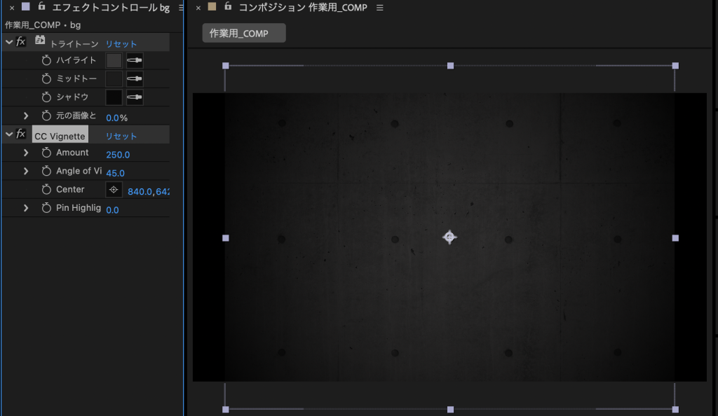 • CC Vignetteエフェクトをかけ、周辺光量をさげる。ここではamountを250にした
