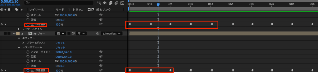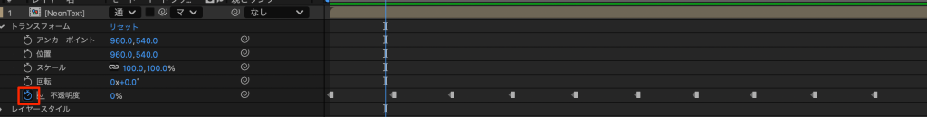• 不透明度にキーフレームを打ち、最初は0、1秒後に100というのを繰り返し設定する