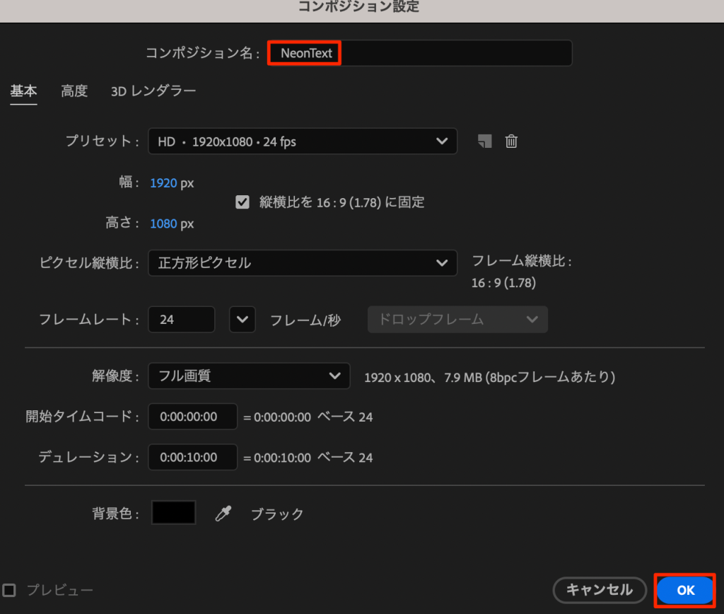 • 新規コンポジションを1920px × 1080px、10秒で作成する