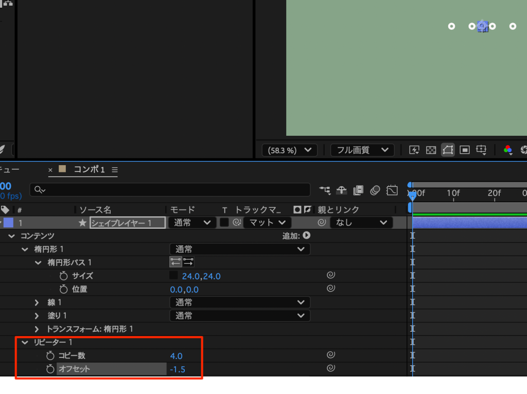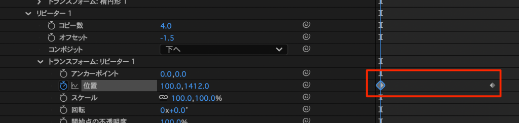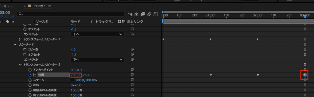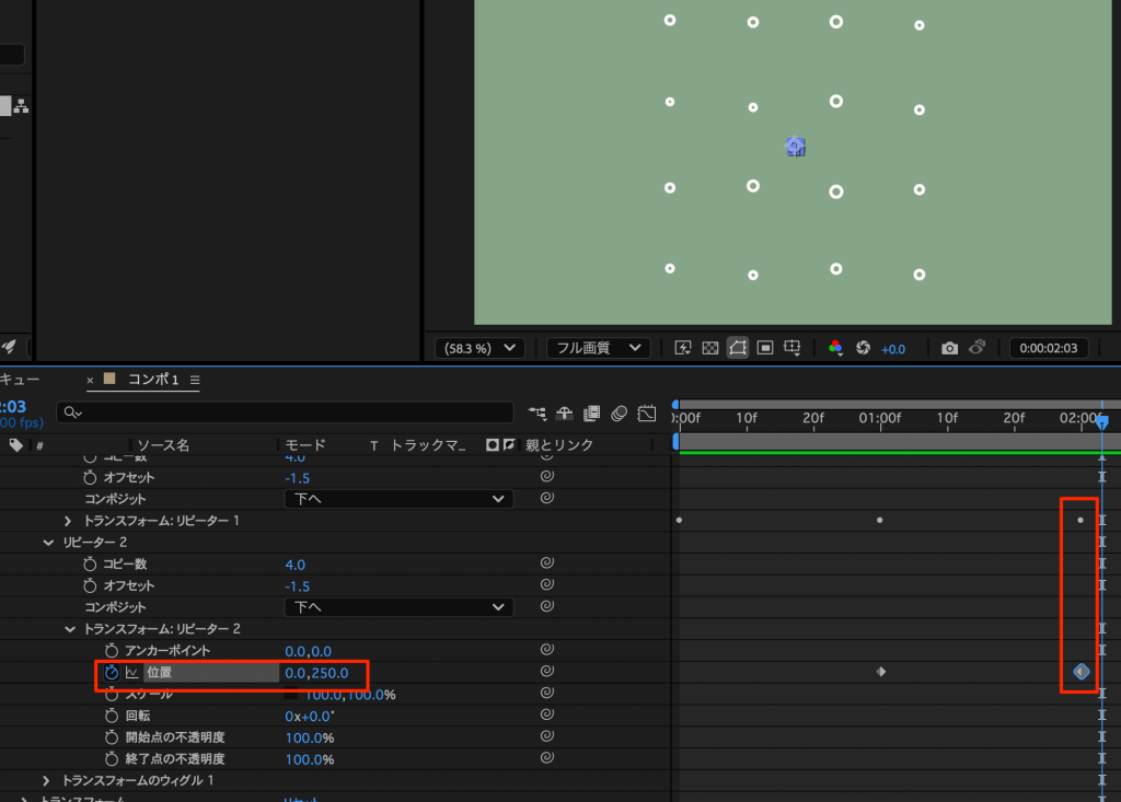 - リピーター2のxを調節してドットが画面外に出ていくようにする