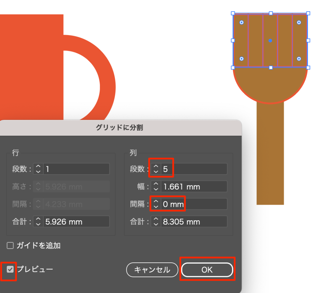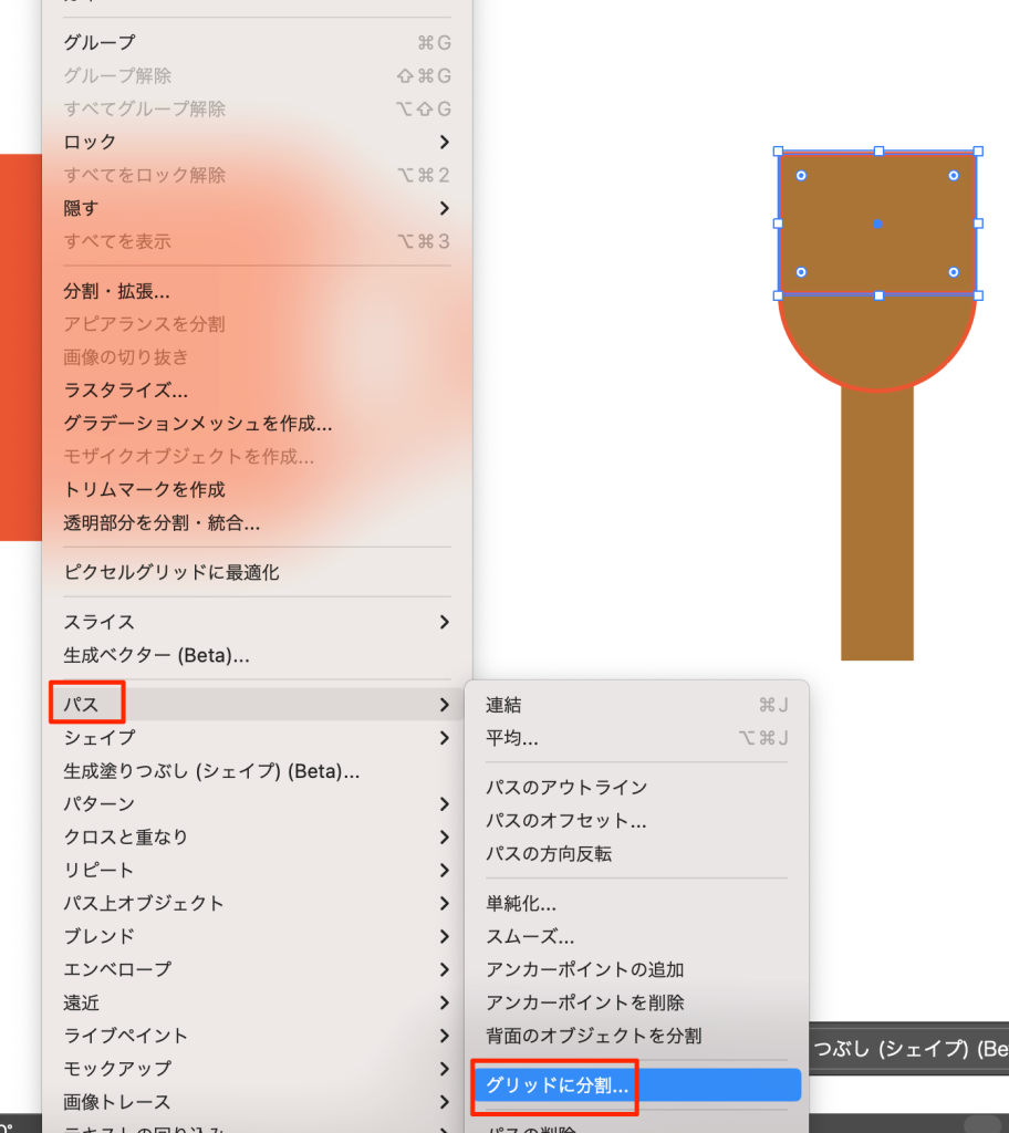 - オブジェクトメニュー->パス->グリッドに分割