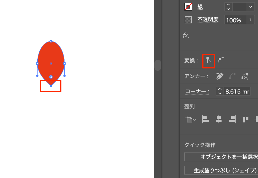 - 楕円を作成し、ダイレクトツールで下辺のポイントを選択し、尖らせる