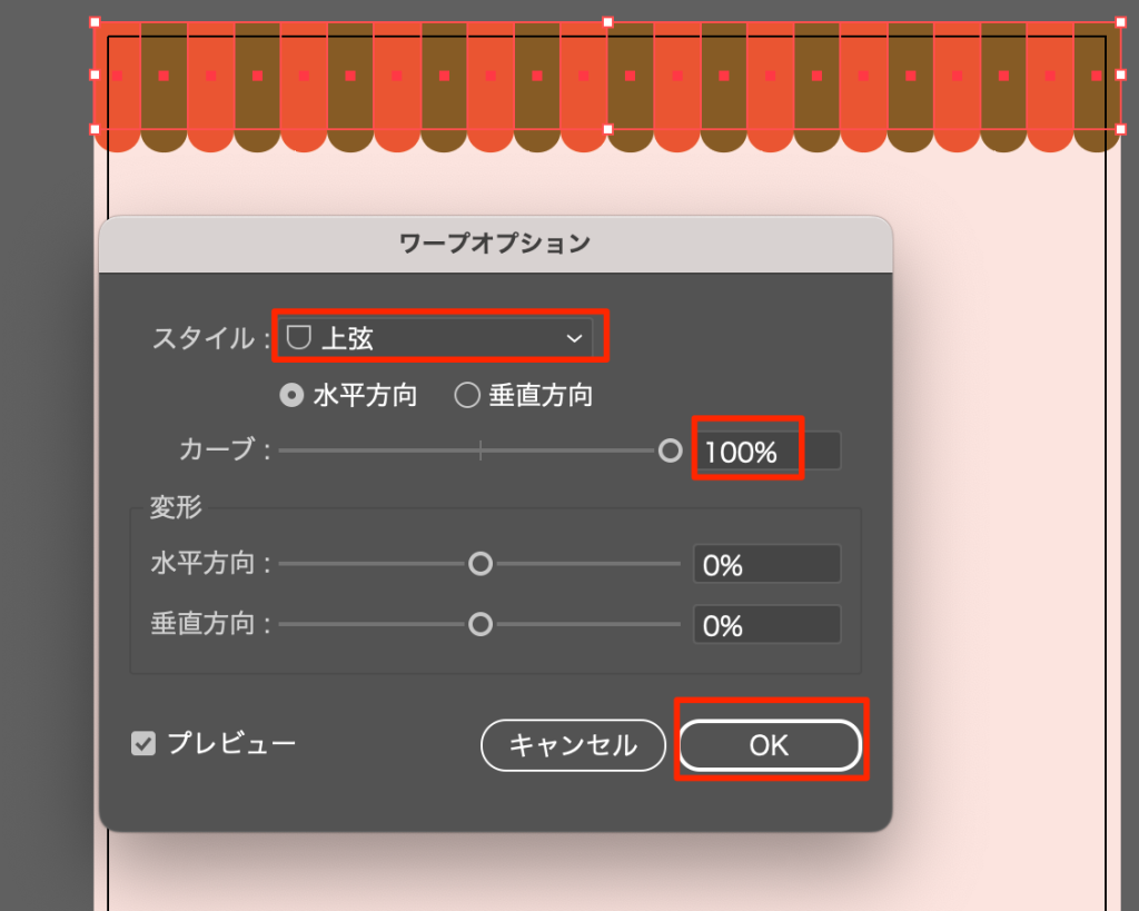 - すべてを選択して効果->ワープから上弦を選び100%にする