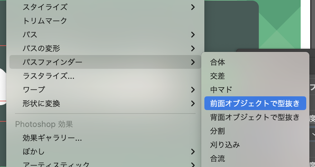 - 効果->パスファインダー->全面オブジェクトで型抜き
