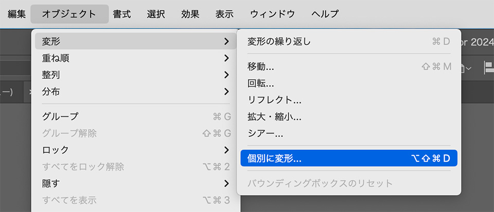 • パターンのサイズだけを拡大縮小したいときは、上のメニューから「オブジェクト」>「変形」>「個別に変形」を選択して、個別に変形のパネルを開きます。