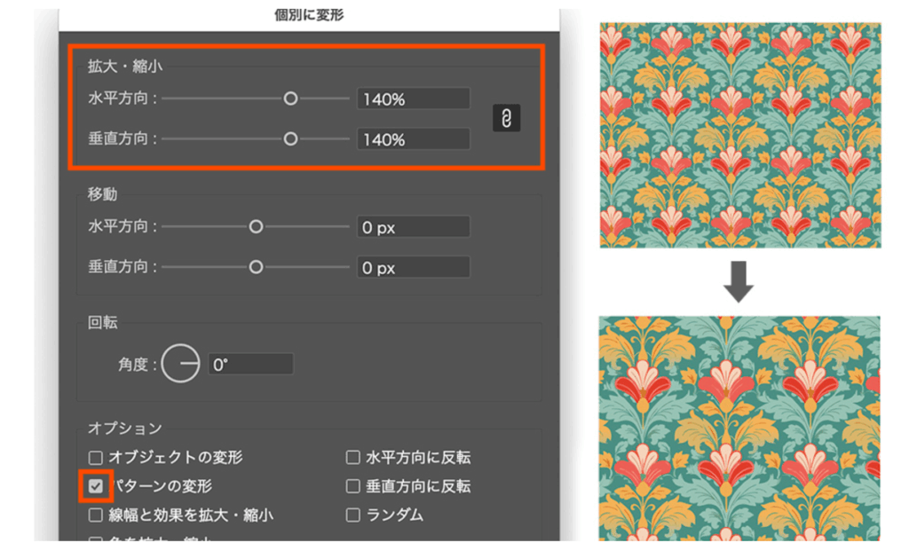 • 設定 一般にあるパターンの変形にチェックをいれるとパターンの大きさも連動する