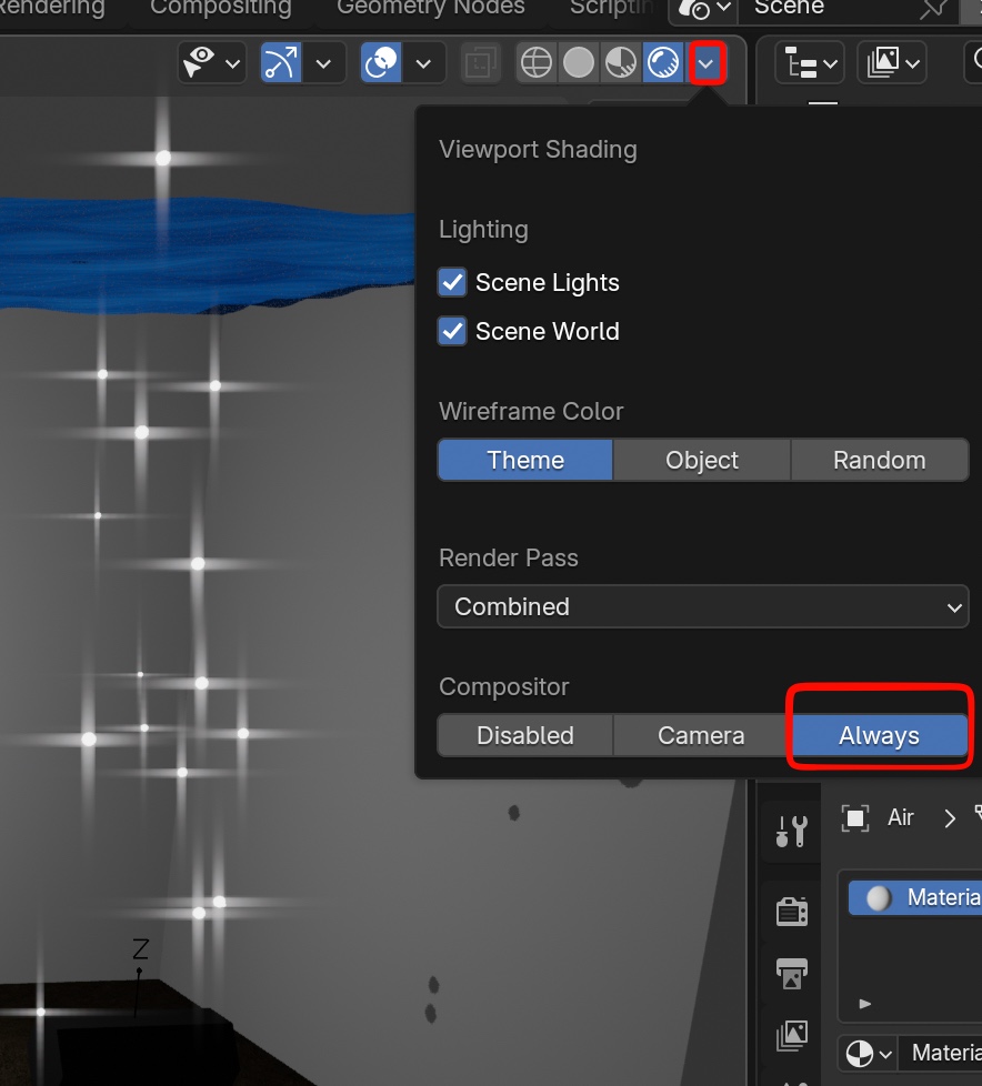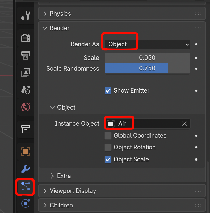 - Render -> Object -> インスタンスオブジェクトに先に作成したAirを選択