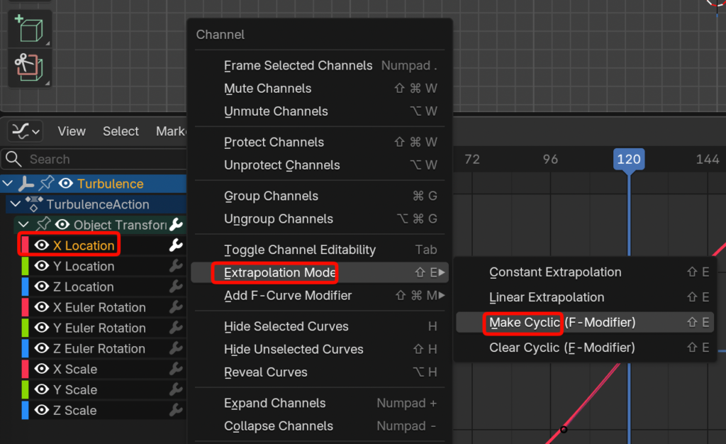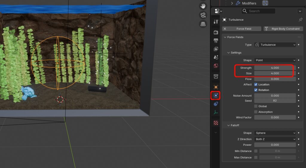- strengthやサイズを設定し、フォースフィールドを動かすことによって流れを表現する
