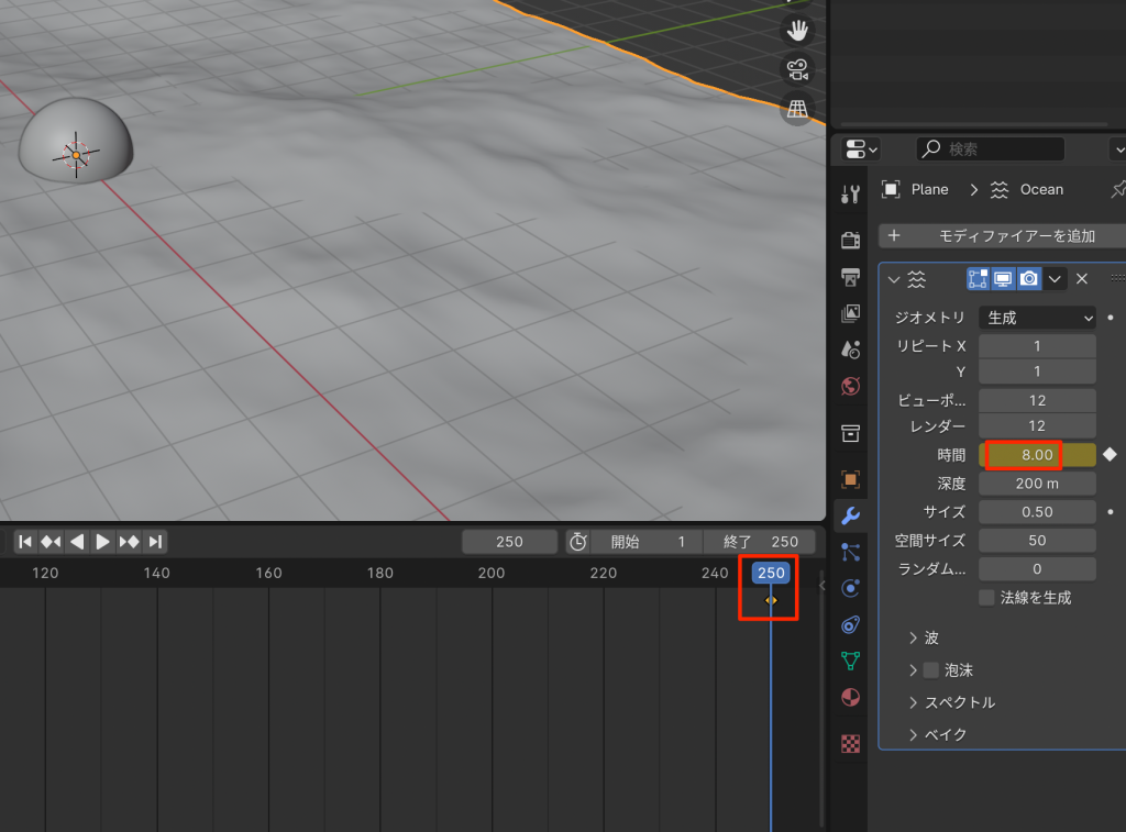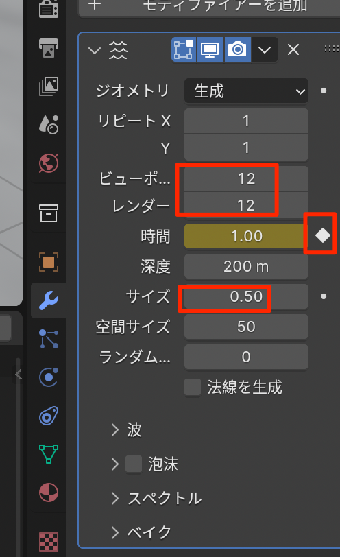 - 新規平面を追加し、モデから物理->海洋モディファイヤーを追加