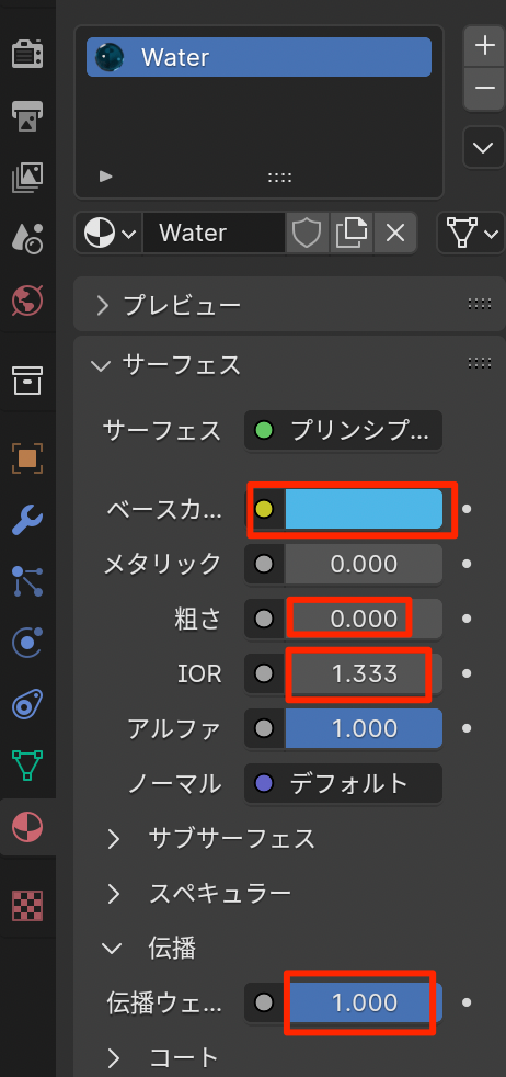 - 海面を選択し、新規にマテリアルを追加する(名前をwater)