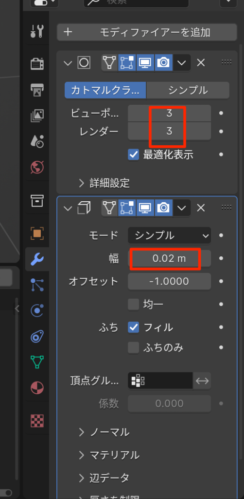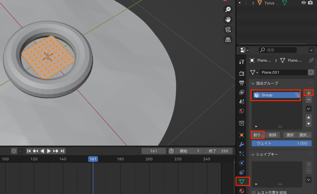 - 頂点を全選択した状態でデータプロパティを選択し頂点グループを作成し割当を押す