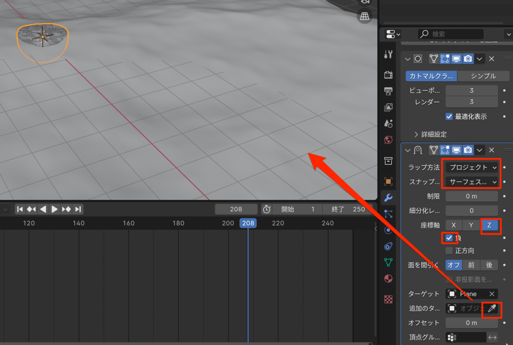 - ターゲートを先程の平面、頂点グループを先ほど作成したグループに設定する