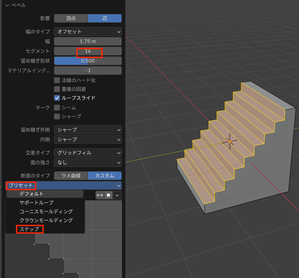 Ble 階段 Blender 2025.05.242025.08.17 目次 チュートリアル成果物 作業のながれ作成を終えた感想 チュートリアル https://youtube.com/shorts/La6aGxXredI?si=XEB4lOLCOX4GBUl8 成果物 作業のながれ 編集モードにして辺を選択しベベル(ctl+b)をかける プリセット ステップ セグメント数を調節 作成を終えた感想 知っていれば簡単というやつ。こういったワンポイントレクチャーもありがたい。