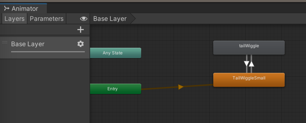 - 新規AnimatorControllerを作成し、baseレイヤーに尾ヒレのアニメを2つ配置