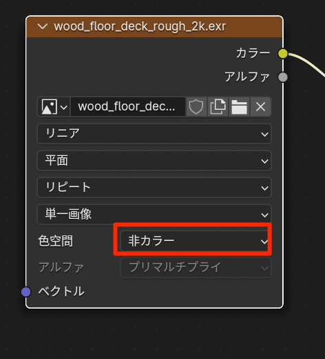 • [重要]ラフネスマップの場合はカラーを非カラーにして、画像補正がされないようにする。