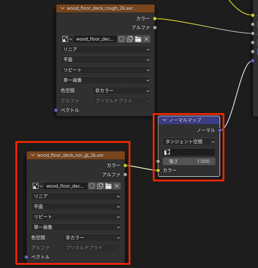 • ノーマルマップノードはこの色情報から法線情報に変換するノード