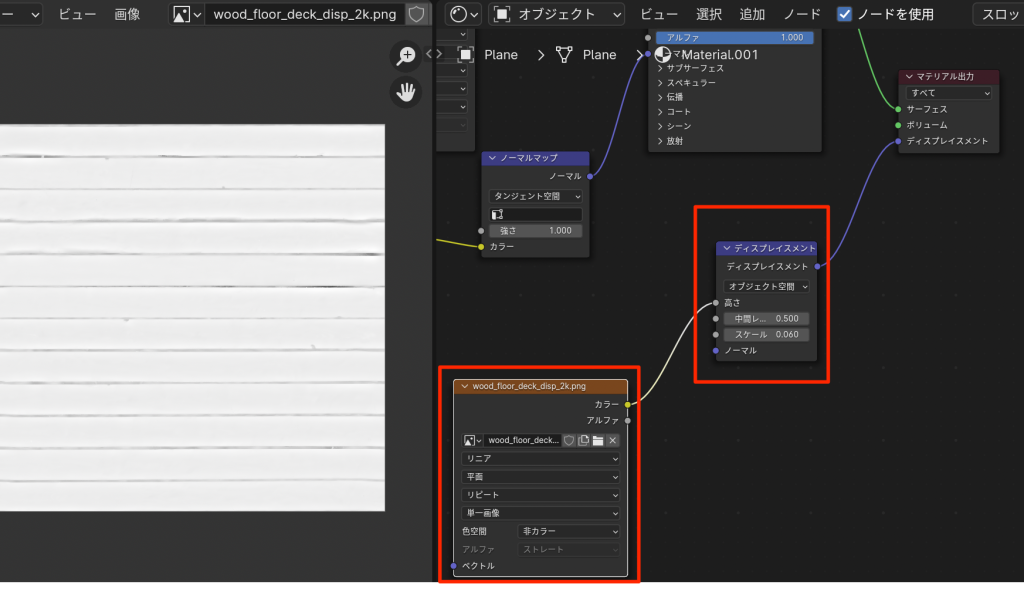 • 同じように画像テクスチャにディスプレイスメントマップを選択する