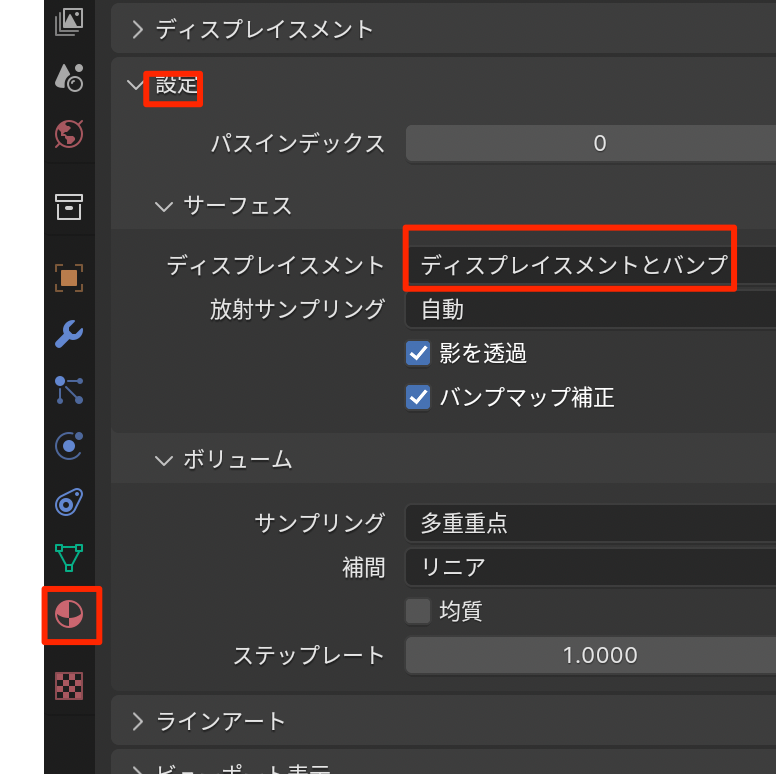 • マテリアルの設定のディスプレイスメントをディスプレイスメントとバンプに変更する