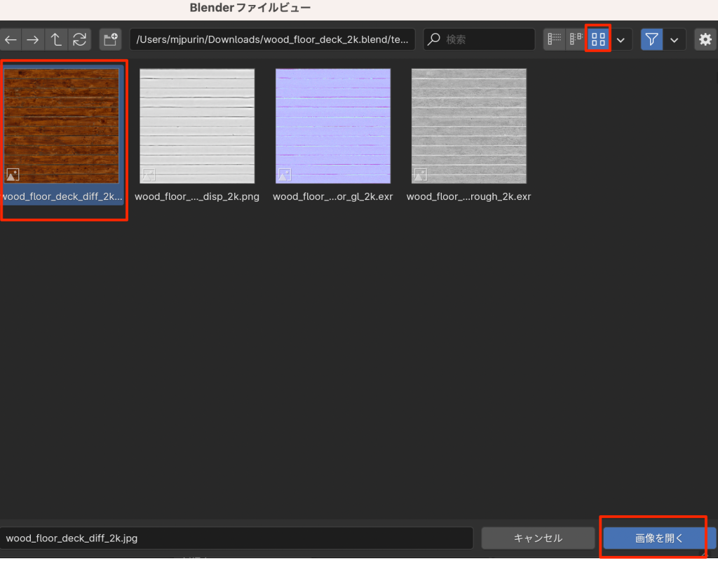 • 開くを押し、先程ダウンロードしたファイルの中からdiff(ディフューズ)を選ぶ