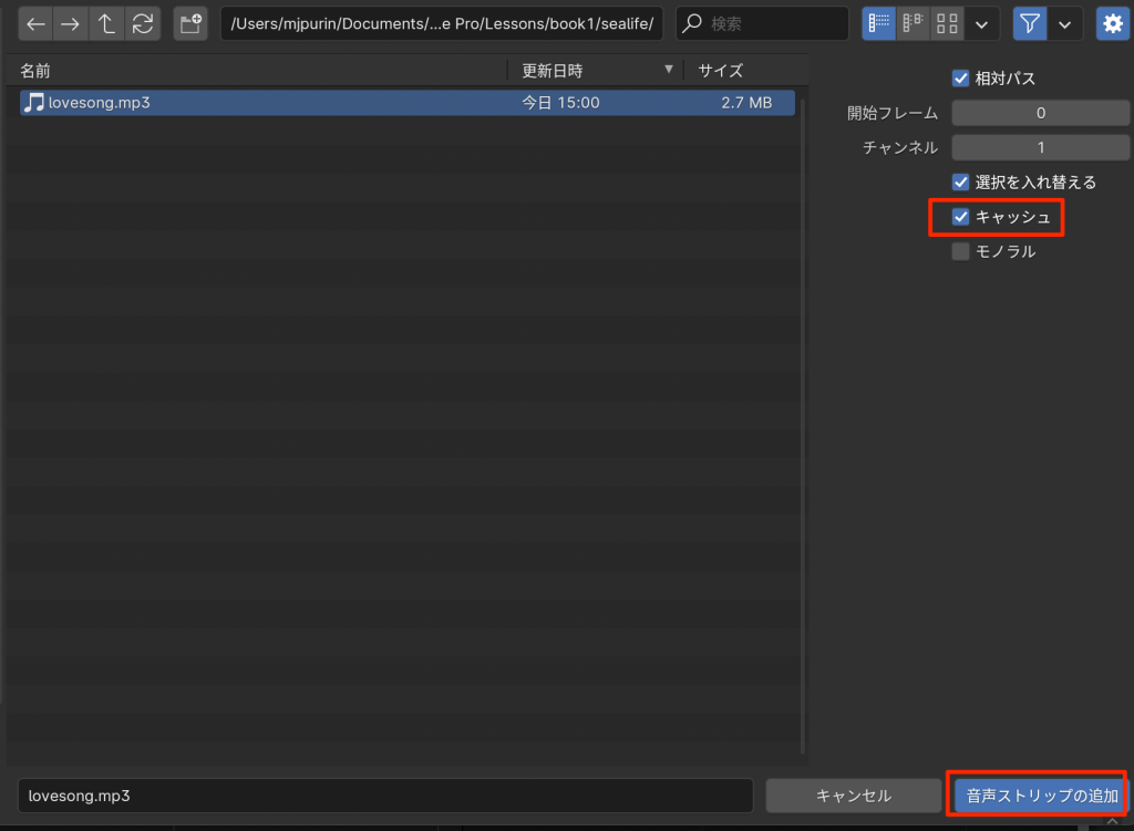 - このときキャッシュにチェックを入れる(モノラルにいれるとさらに軽くなる)