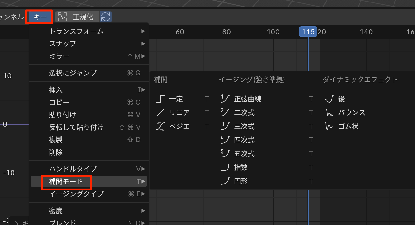 - 2つのキーフレームを選択してキーから補完モードを選択できる