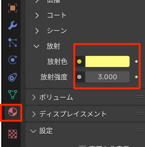 - 新規マテリアルを作成し放射、放射強度を設定する