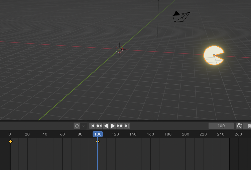 - 100フレームに移動し、gx10でパックマンを右に移動させキーフレームを打つ