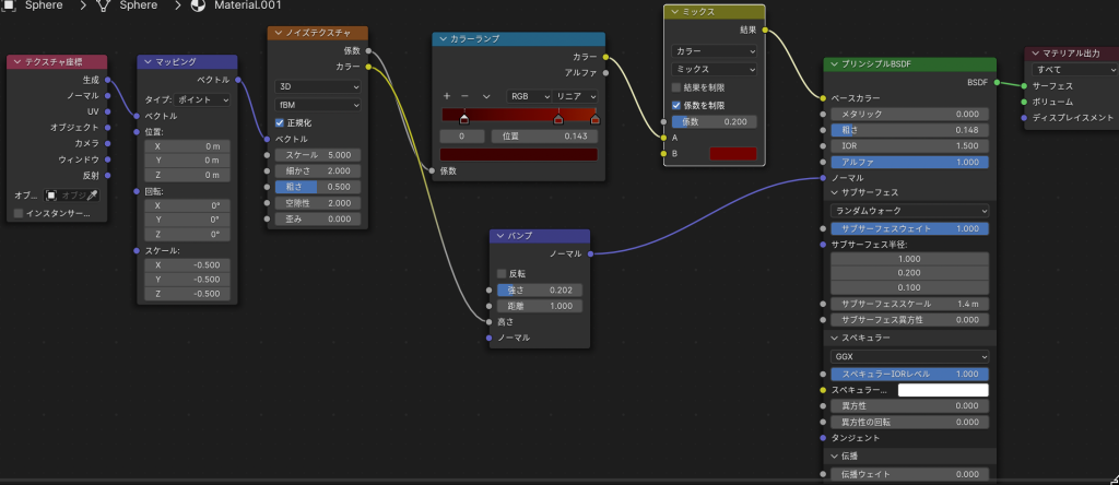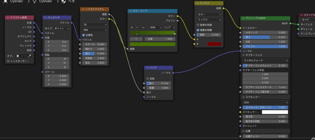 - カラーランプ、ノイズテクスチャ、バンプ設定