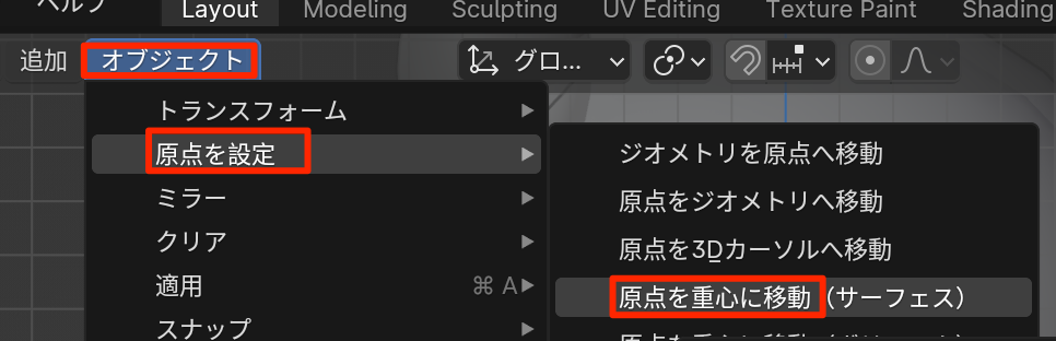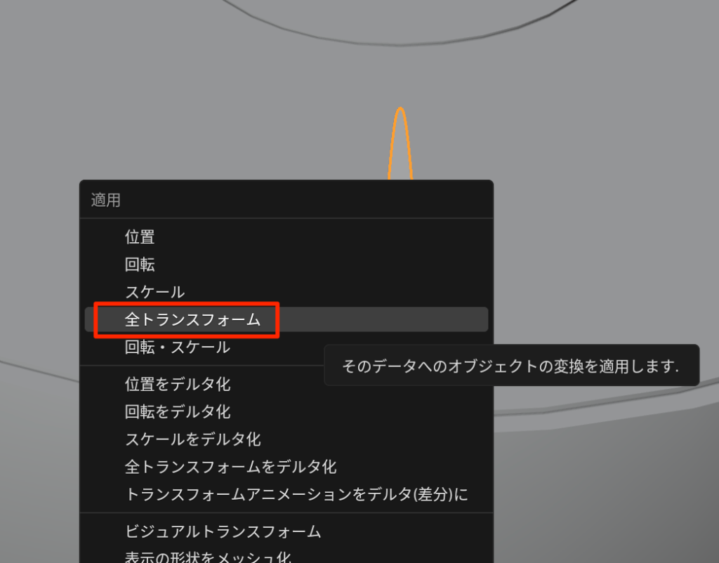 - 変形後の状態がスケール1となり、オブジェクトの原点がワールド原点に移動する