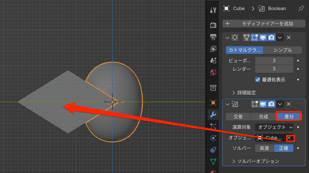 - ミラーモデを追加し、スポイトツールから基準となるオブジェクトに顔を選択する