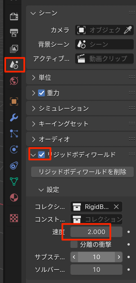 - シーン->リジッドボディワールド->速度2