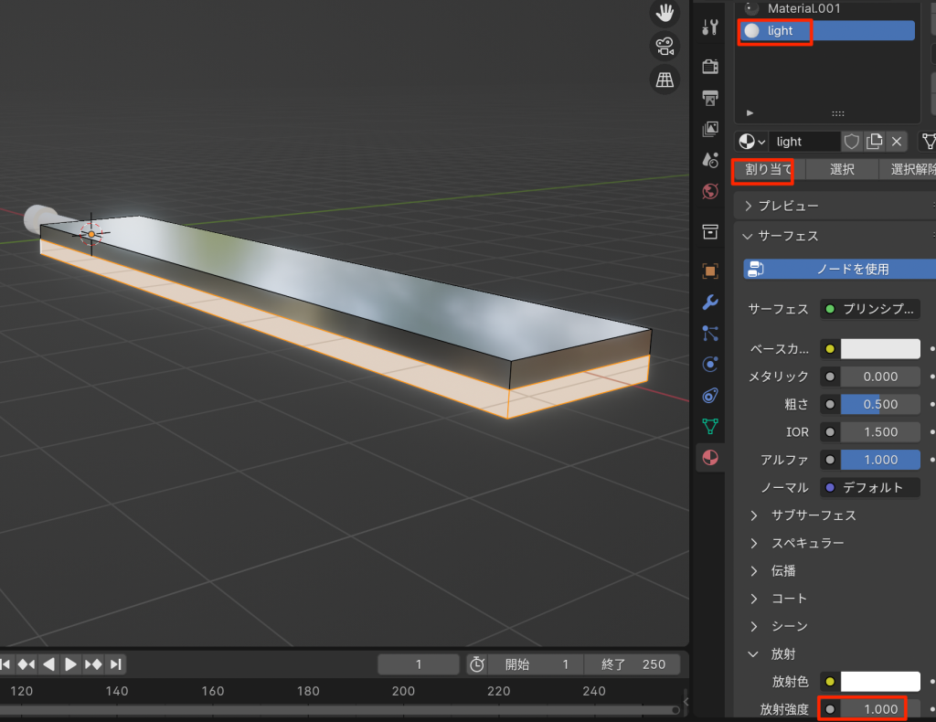 - 放射に1を入れる(レンダーからブルームにチェックをいれておく)