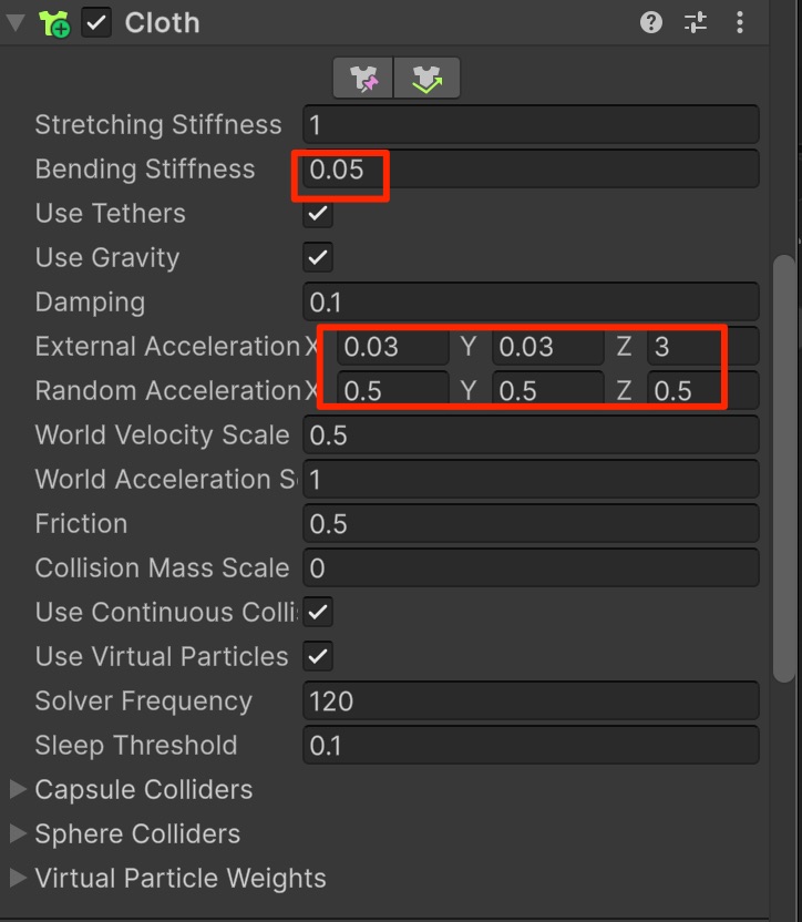 - z軸方向から風を当てるのでExternal Acceleraionのzの値を大きくしておく