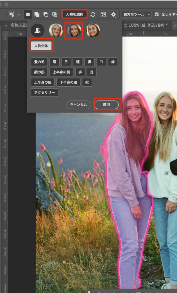 - クイック選択、投げ縄を使って選択範囲を調整