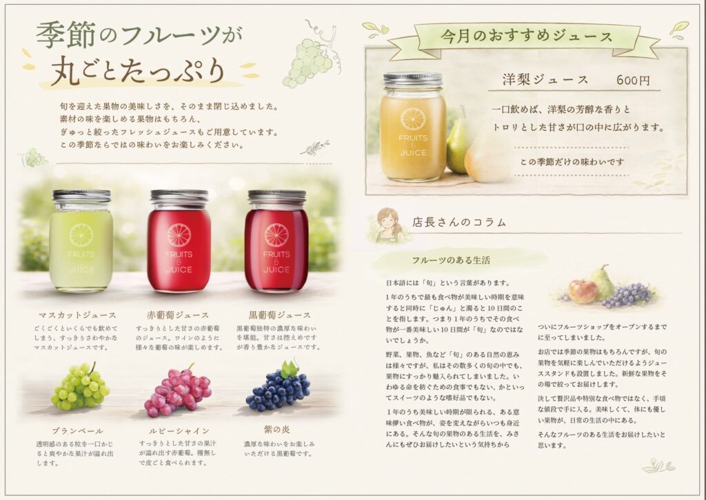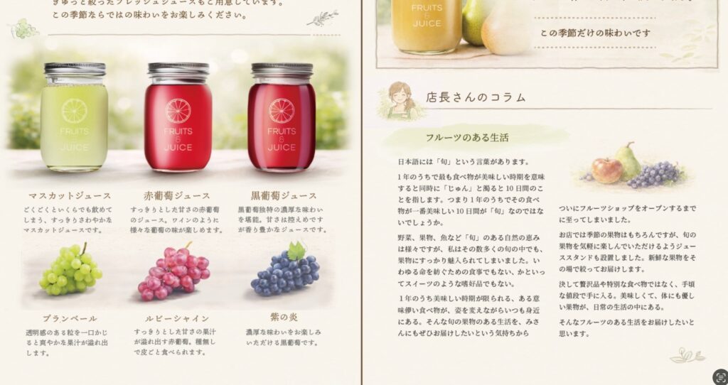 - そもそもぶどう画像の幅がせまいからこの余白が目立ってしまっている。ジュース画像と同じところまで広げればよいのではないだろうか?