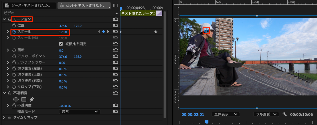 - 最初のフレームでスケールを120にしてキーフレームを打つ