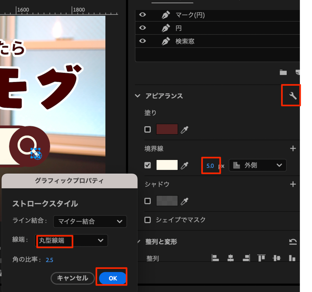 - 円の境界線を562222,幅を8,境界線の位置を内側