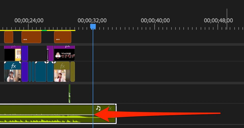 - 再生して問題がないようだったら30:00のところまで選択ツールで右端をドラッグして縮める