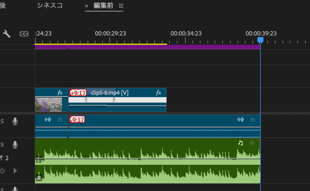 - オーディオクリップの末端を動画の尺にあわせて切る