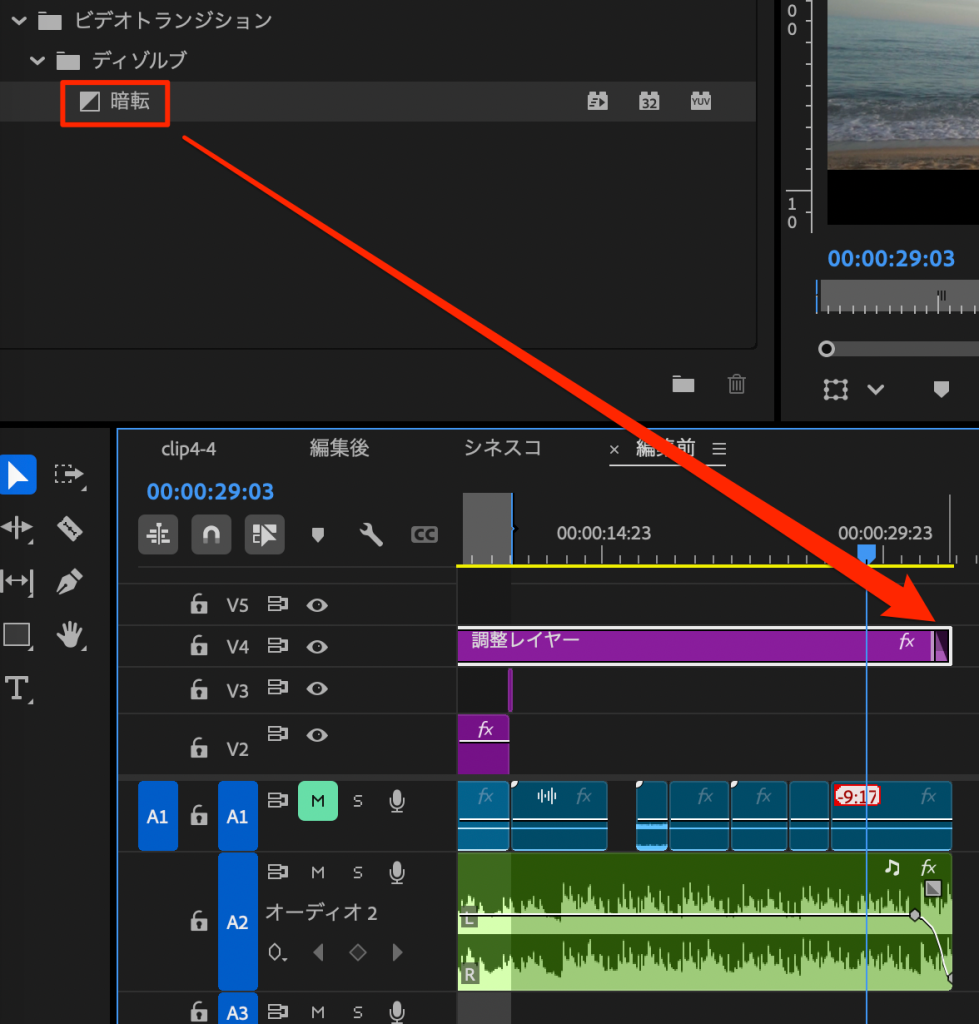 - 調整レイヤーの末端に暗転エフェクトを適用する